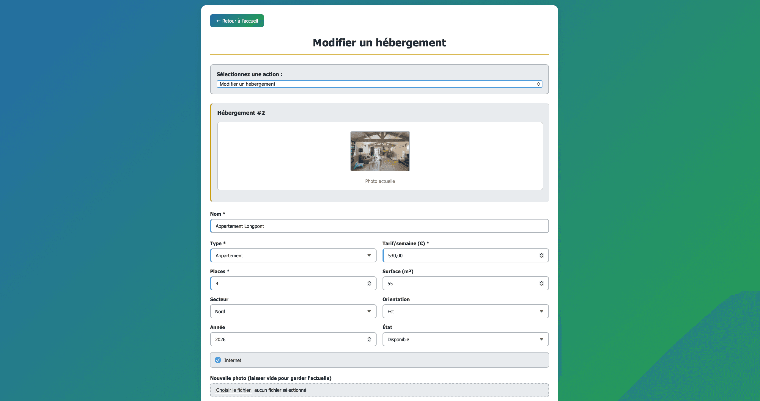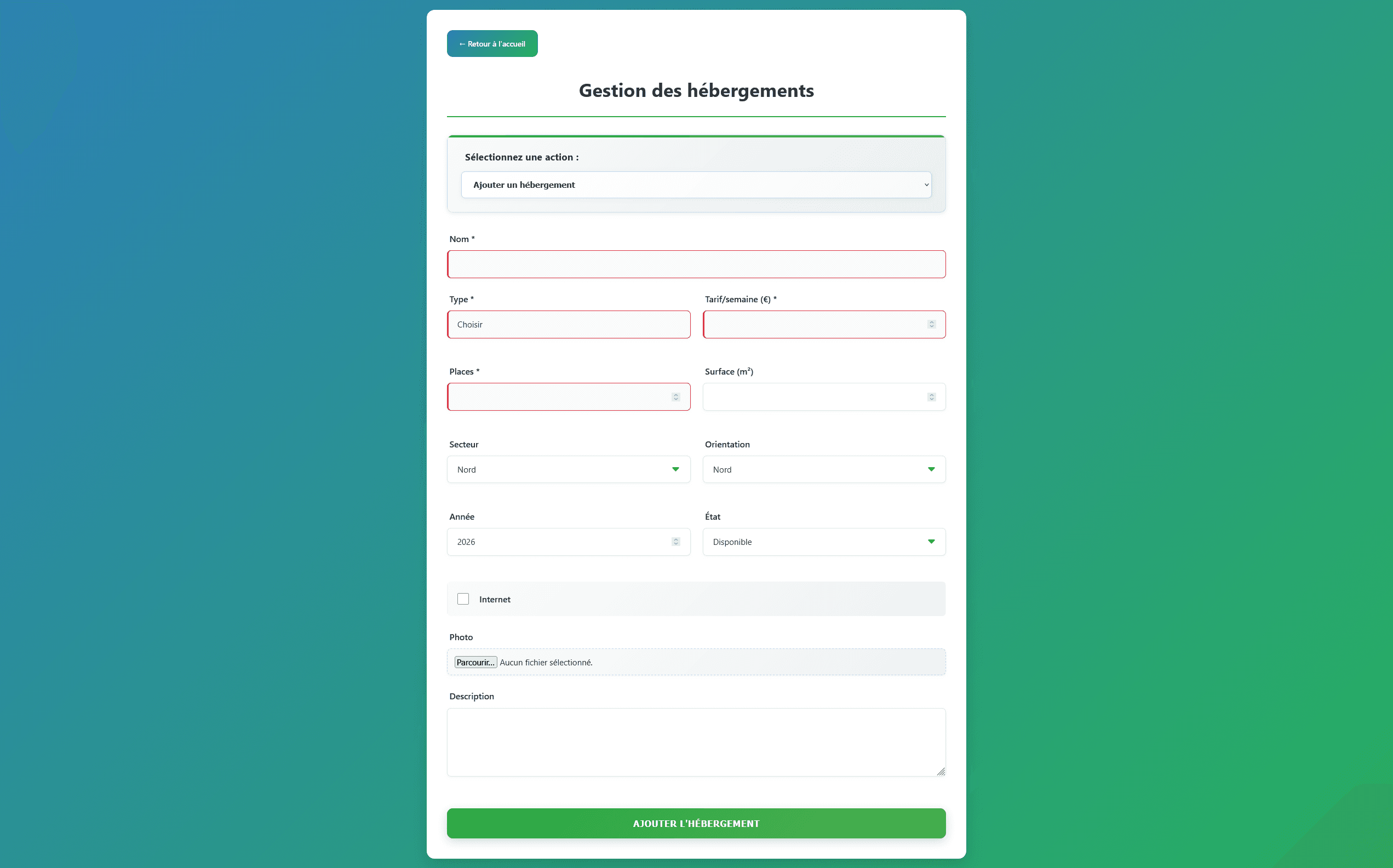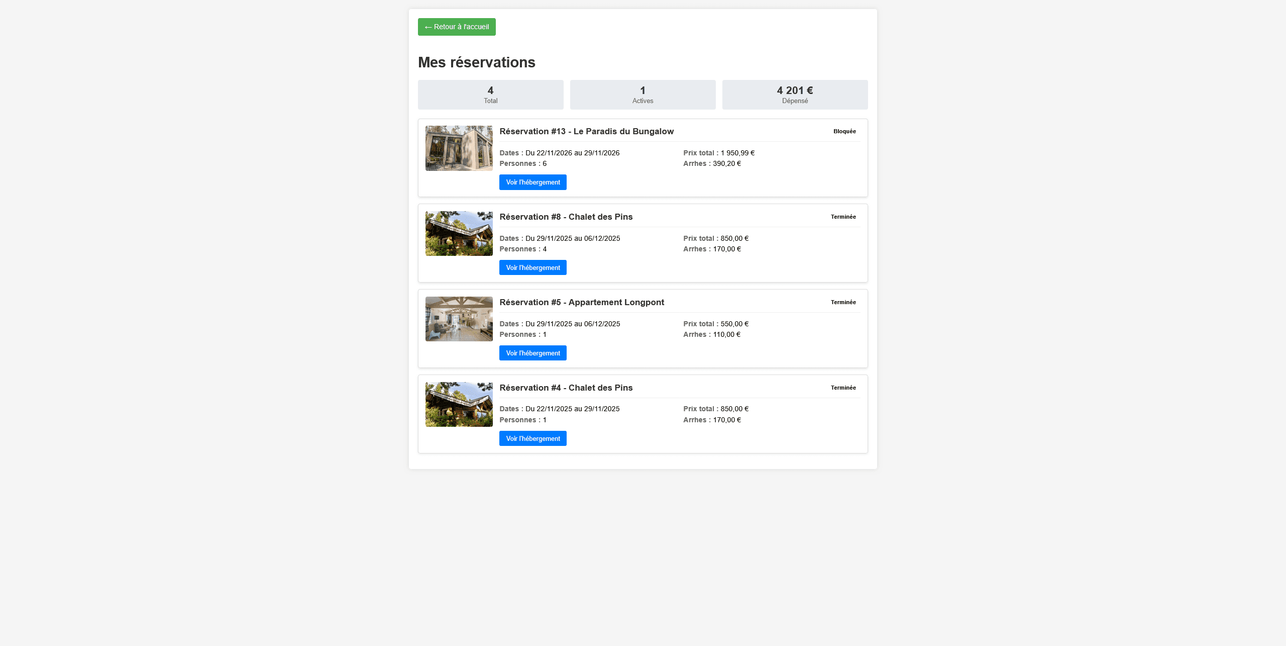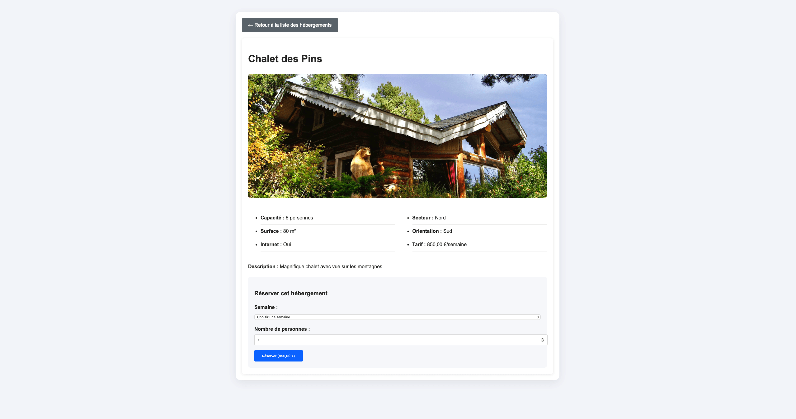 L’utilisateur peut parcourir les différentes offres, visualiser les informations principales de chaque hébergement (nom, description, image, caractéristiques) et accéder à une page de détail pour en savoir plus ou effectuer une réservation. Cette organisation permet une prise en main rapide et une consultation efficace des disponibilités.