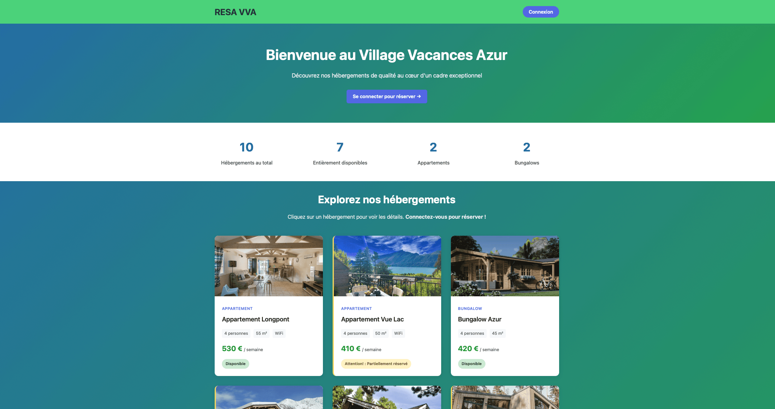 Cette page correspond à l’accueil de l’application RESA VVA, qui met directement en avant les différents hébergements disponibles, à la manière d’une plateforme de réservation en ligne comme Airbnb.